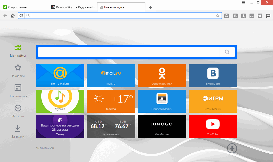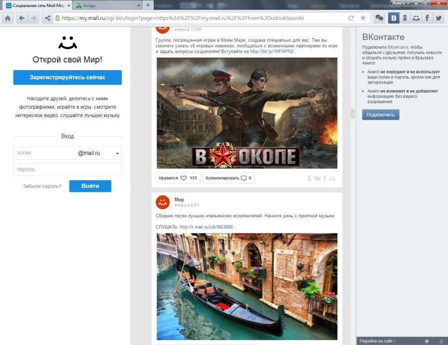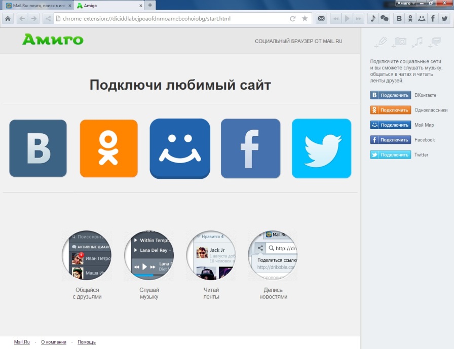 Особенность браузера состоит в том, что в него уже встроен модуль просмотра ленты в социальных сетях, без необходимости открытия самих соц. сетей, можно общаться, слушать музыку, это довольно удобно, ведь лента периодически обновляется.